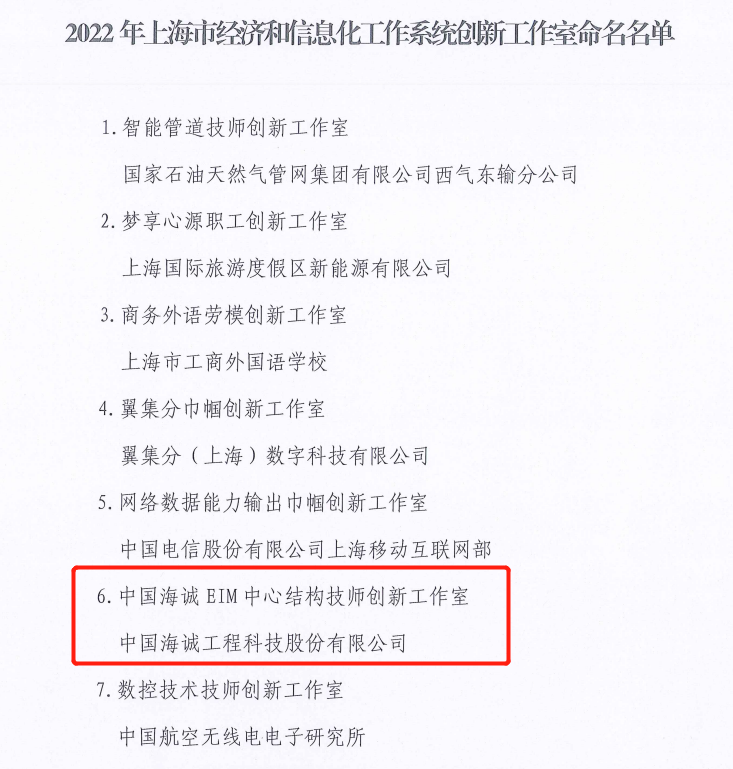 7月12日,上海市经济和信息化工作系统工会工作委员会正式发布了《关于命名2022年海市经济和信息化工作系统创新工作室的决定》,市经信系统工会授予“中国海诚EIM数创中心结构技师创新工作室”。