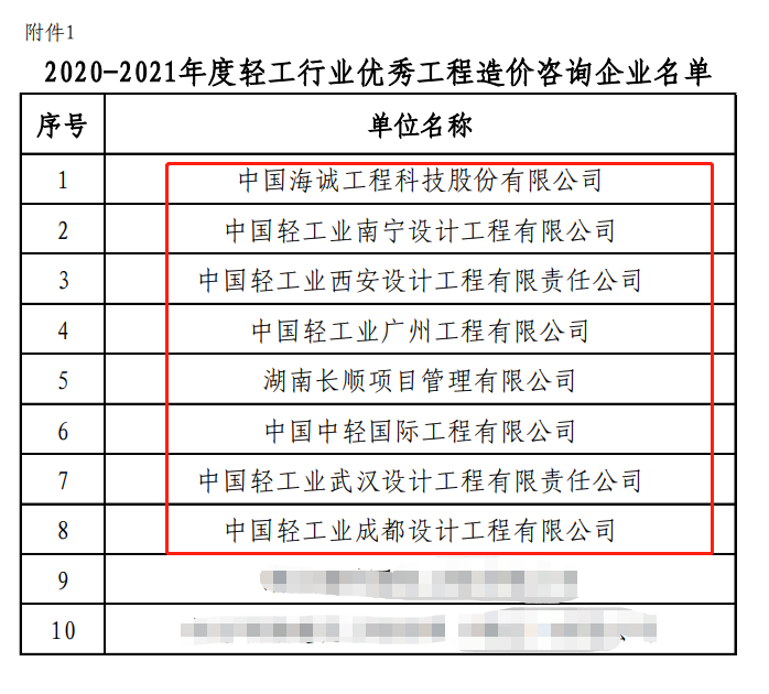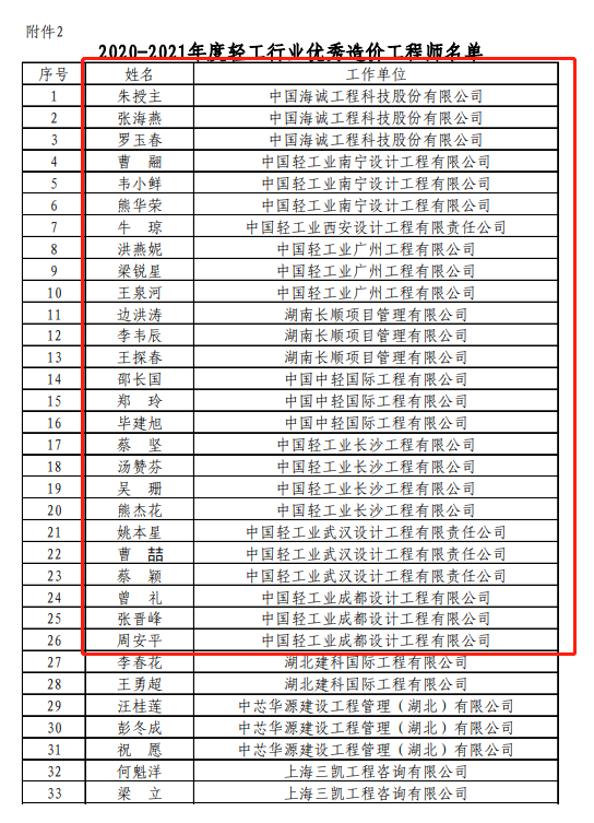 日前,中国轻工业工程建设协会公布了“2020-2021年度轻工行业优秀造价咨询企业和优秀造价工程师(专业)评价结果”,中国海诚及所属广州公司、武汉公司、南宁公司、成都公司、西安公司、北京公司、湖南长顺均荣膺“轻工行业优秀工程造价咨询企业”称号,同时公司26名员工被评为“优秀造价工程师(共33名)”,40名员工被评为“优秀专业造价人员(共45名)”。