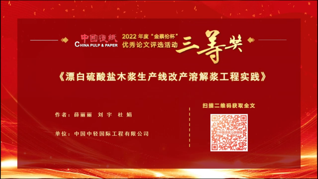 近期,中国海诚所属中国中轻国际工程有限公司组织撰写的《漂白硫酸盐浆木浆生产线改产溶解浆工程实践》荣获《中国造纸》2022年度“金蔡伦杯”优秀论文三等奖。
