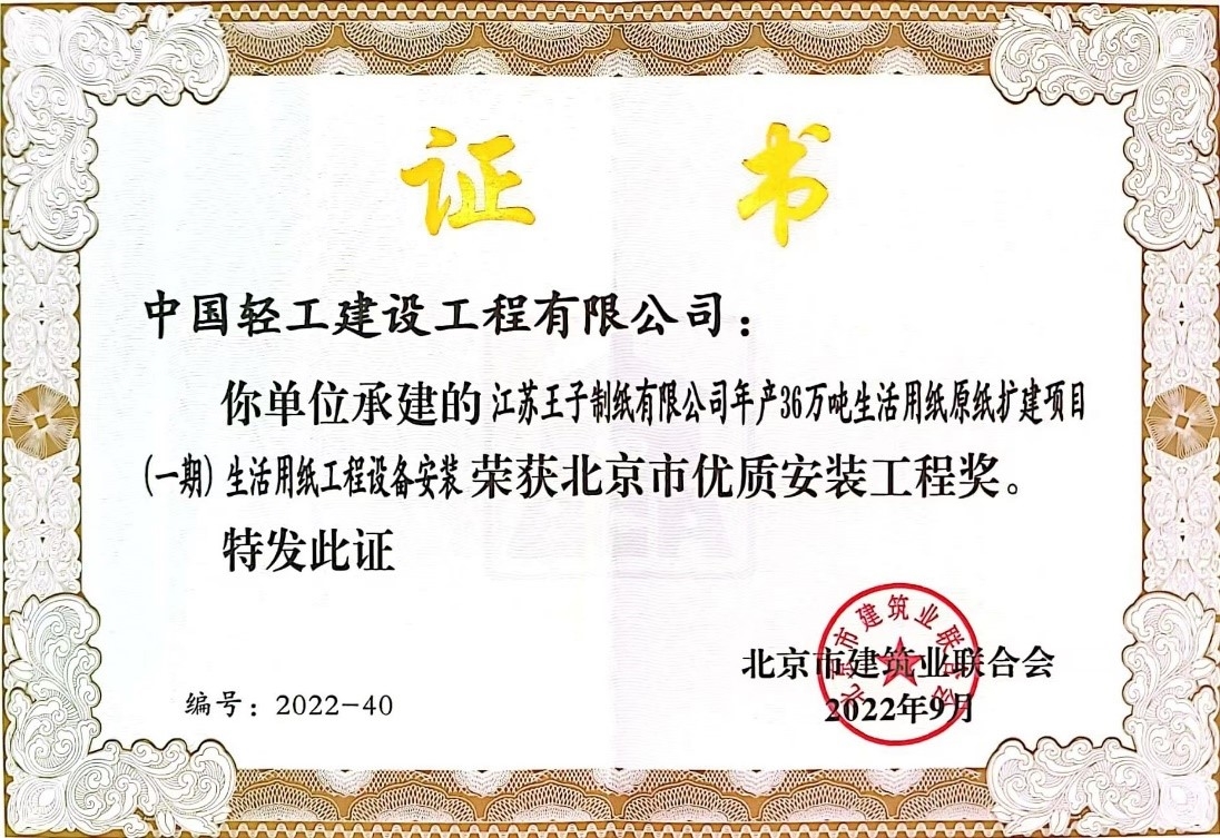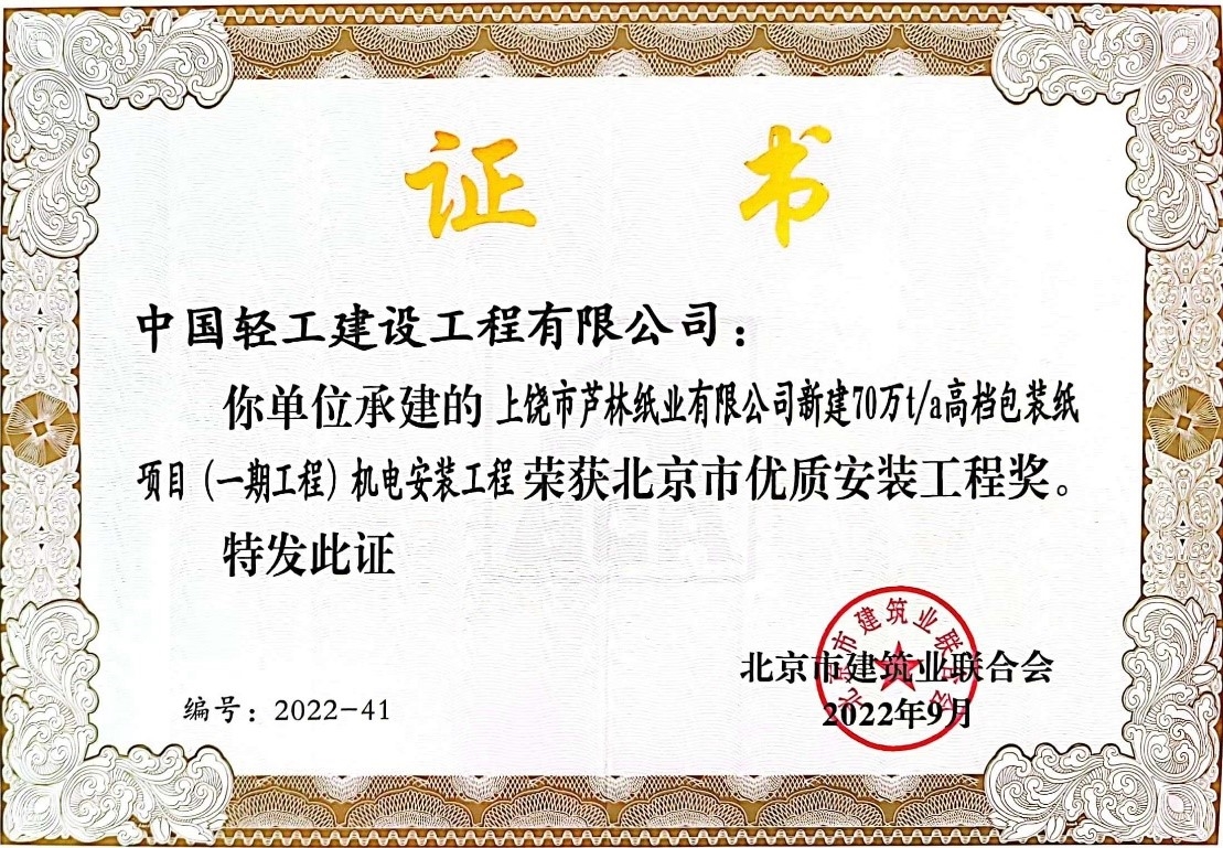 近期,北京市建筑业联合会发布“关于公布2022-2023年度(第一批)北京市优质安装工程奖评选结果的通知”(京建联[2022]71号),中国海诚中轻建设承建的“上饶市芦林纸业有限公司新建70万t/a高档包装纸项目(一期工程)机电安装工程”和“江苏王子制纸有限公司年产36万吨生活用纸原纸扩建项目(一期)生活用纸工程”荣获北京市优质安装工程奖。