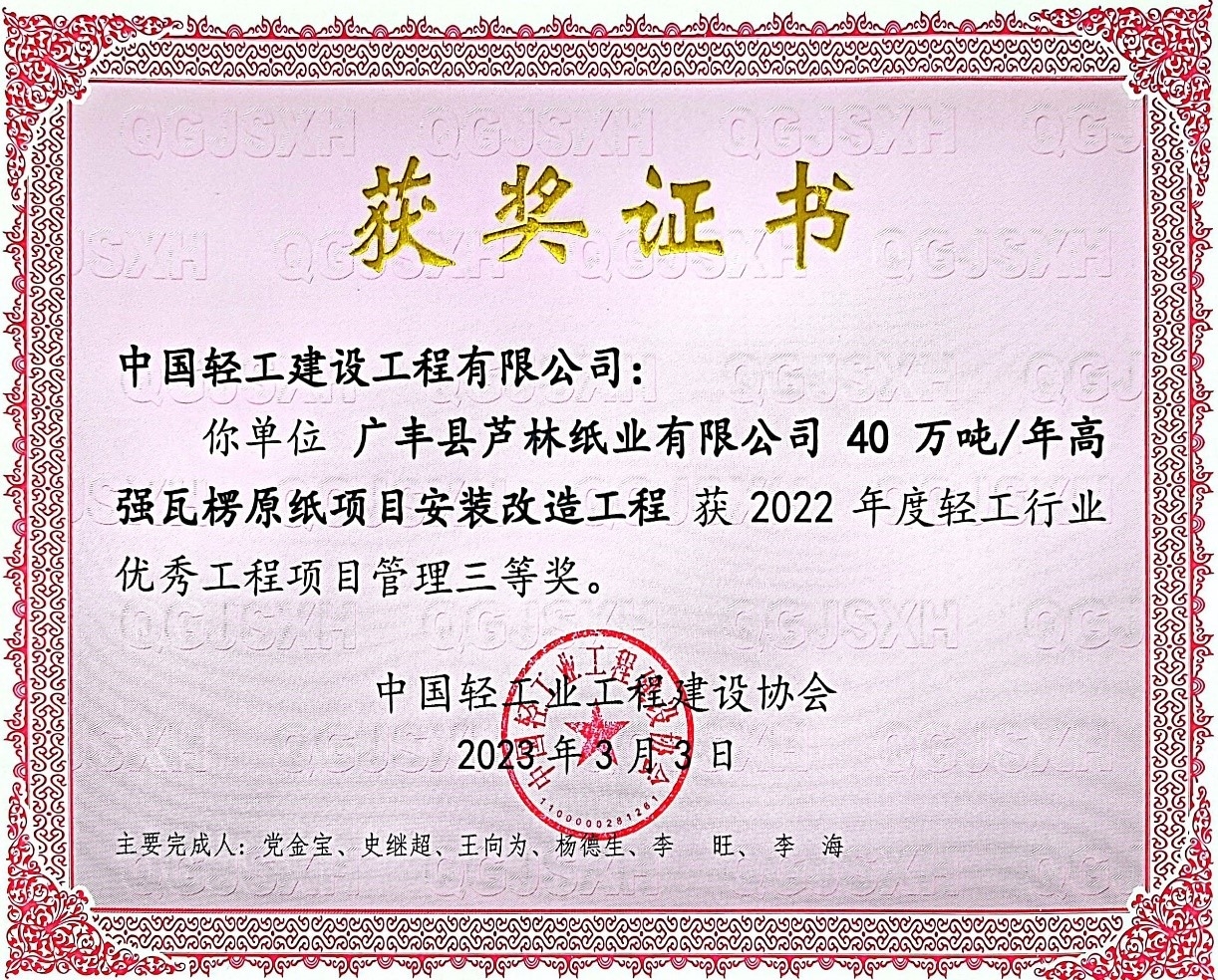 近期,中国轻工业工程建设协会发布“2022年度轻工行业优秀项目管理和工程总承包评价结果公告”(中轻建协[2023] 10号),中国海诚所属中国轻工建设工程有限公司(以下简称中轻建设)承建的“广丰县芦林纸业有限公司40万吨/年高强瓦楞原纸项目安装改造工程”经评审专家的严格评审,在众多参选项目中脱颖而出,荣获三等奖。