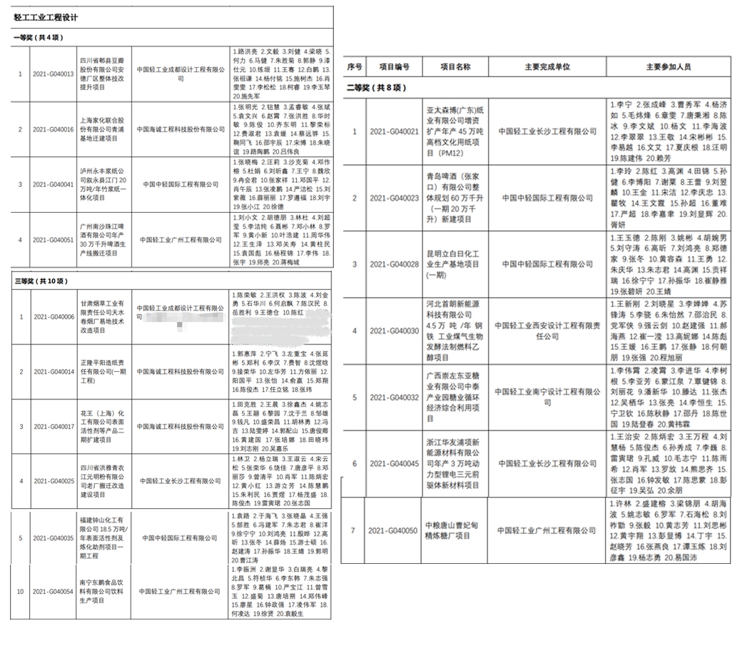 近期,中国勘察设计协会公布2021年度工程勘察、建筑设计行业和市用公用工程优秀勘察设计奖,在轻工业工程设计一栏(共22个奖项),中国海诚及所属单位作为项目主要完成单位包揽一等奖4项、二等奖7项、三等奖6项。