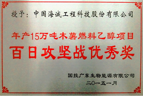 2015年1月19日,国投广东生物能源有限公司召开了年产15万吨木薯燃料乙醇项目“百日攻坚战”总结大会,海诚股份在多个参建单位中表现突出,是唯一荣获“百日攻坚战优秀奖”的设计单位。