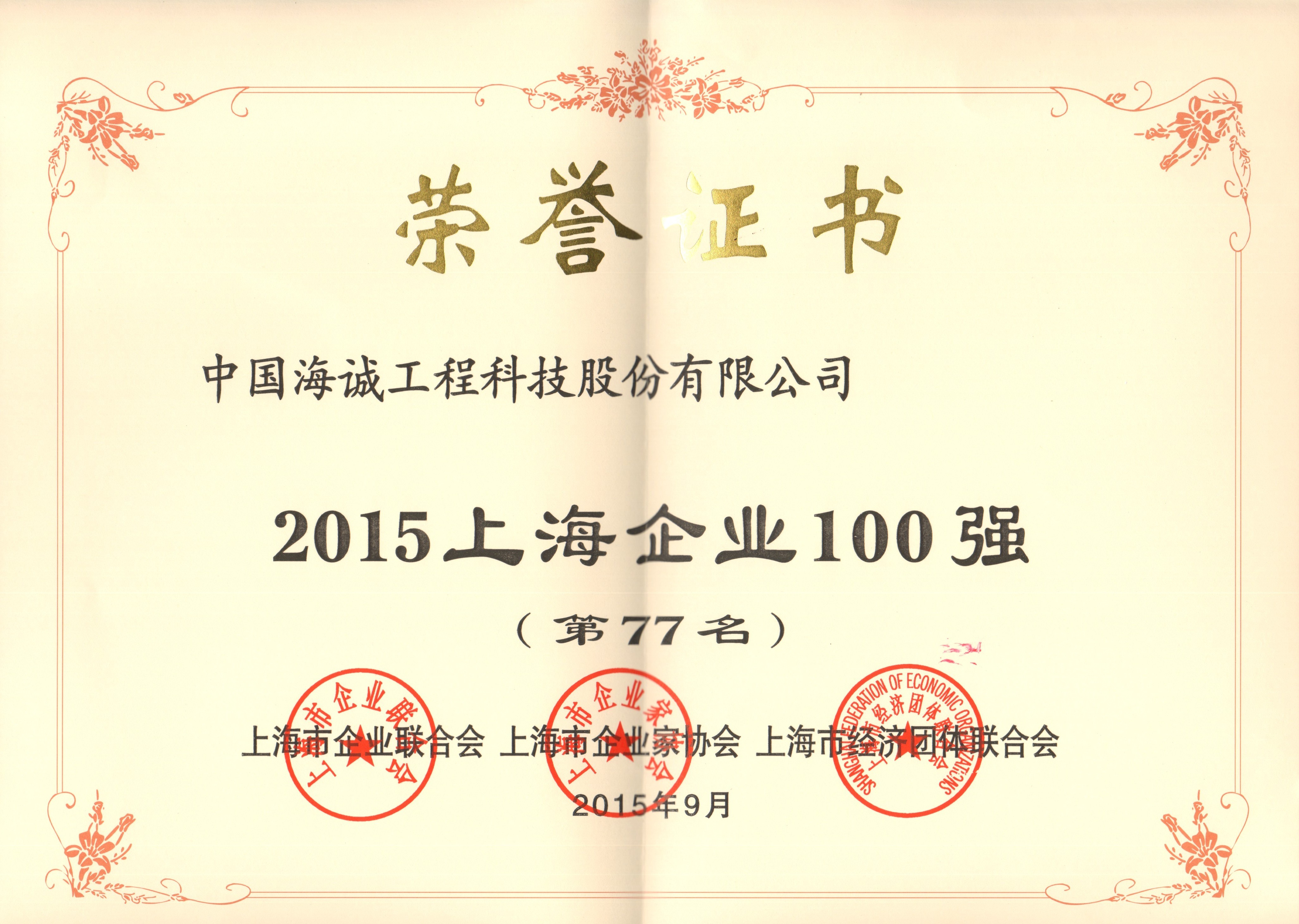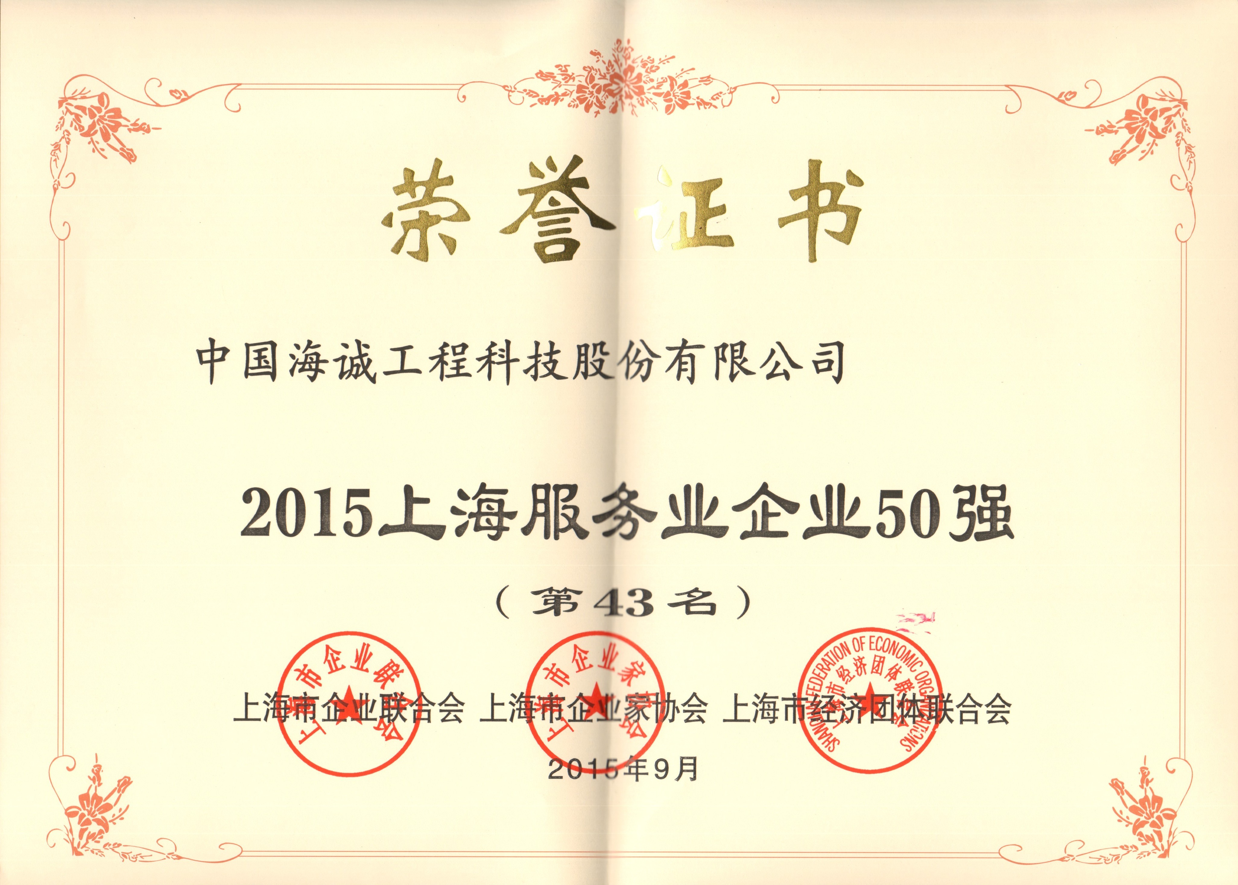 近日,上海市企业联合会、上海市企业家协会和上海市经济团体联合会联合公布了2015年上海企业百强和上海服务业企业50强名单,我公司分别位列第77名和第43名,入围上海企业100强、上海服务业企业50强。