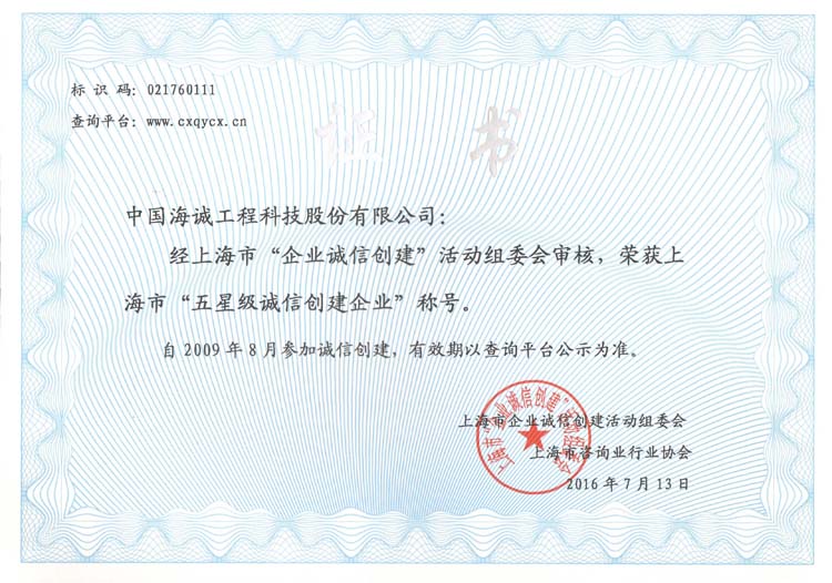 日前,在上海市企业诚信创建评选活动中,公司再次获得“五星级诚信创建企业”荣誉称号,这也是公司自2009年参与此项活动后连续第8年被评为星级单位。
