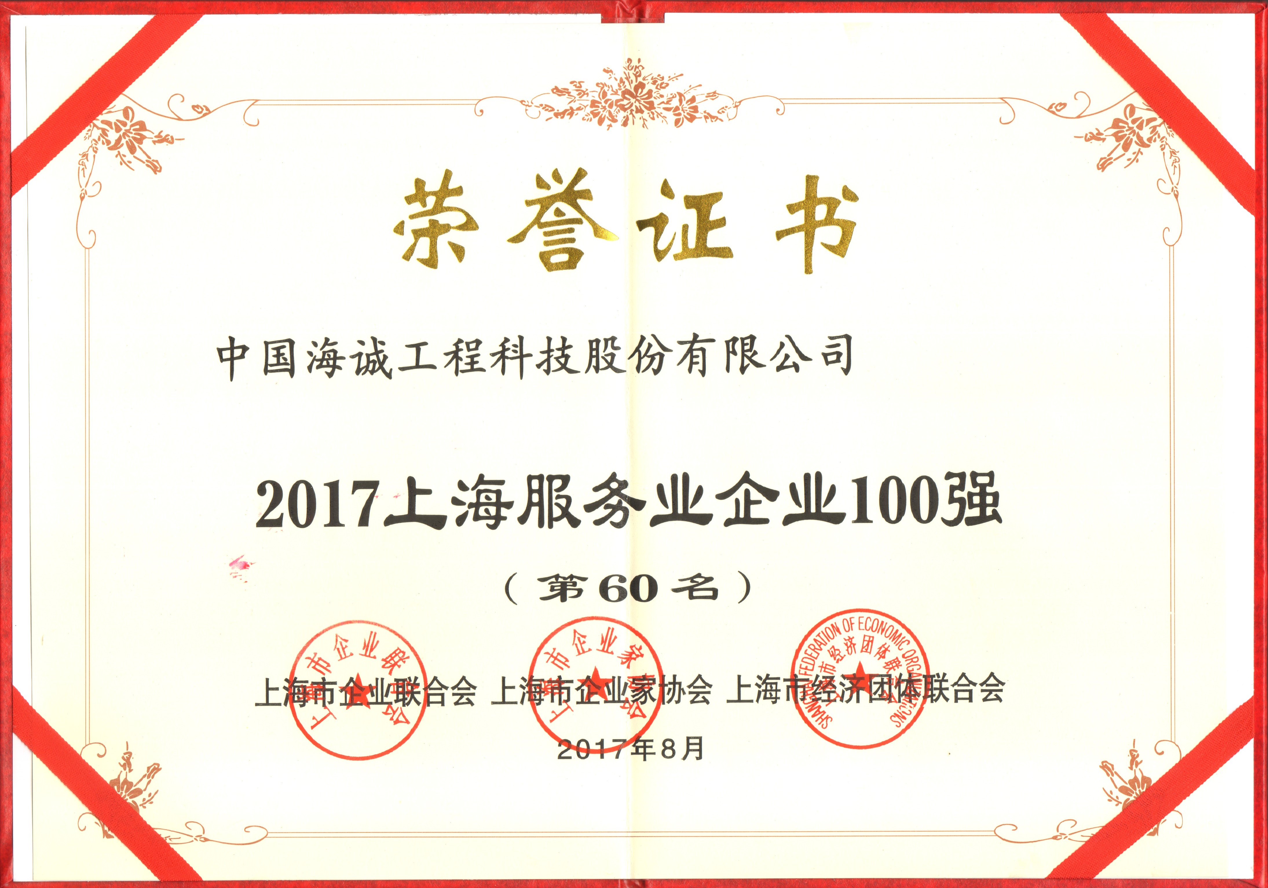 近日,上海市企业联合会、上海市企业家协会和上海市经济团体联合会联合公布了2017年上海服务业企业100强名单,我公司再次入围,位列第60名。