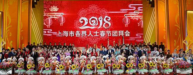 2月14日上午,上海市各界人士欢聚一堂,出席2018年春节团拜会。市领导李强、应勇、殷一璀、董云虎、尹弘与各界嘉宾一起,共同祝愿伟大祖国繁荣强盛,上海明天更加美好,全市人民幸福安康。