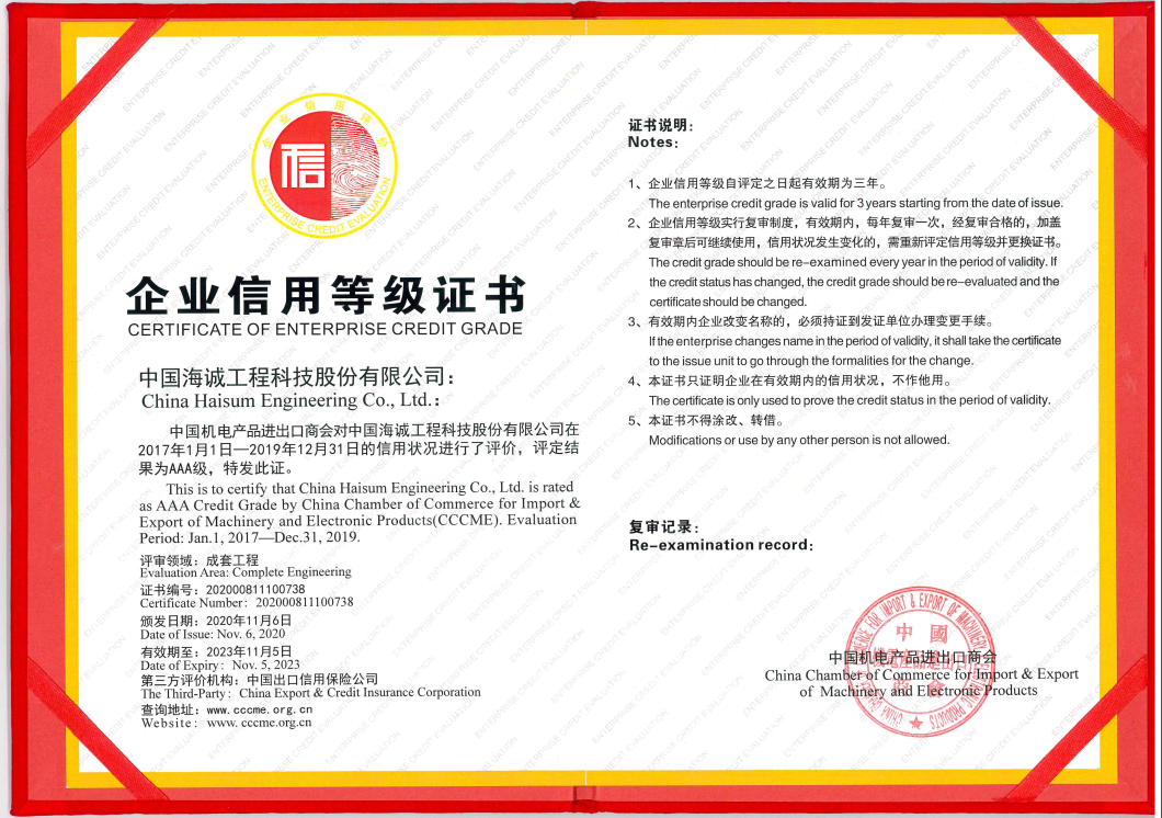 中国机电产品进出口商会作为我国机电产品进出口行业唯一的全国性商会,现有会员企业近万家,具有较强的行业代表性。企业信用等级评价由商务部、国资委牵头,中国出口信用保险公司作为第三方评审机构,中国机电产品进出口商会进行复审。公司自2008年起参加中国机电产品进出口商会企业信用等级评价以来,已连续多年获得AAA级信用企业称号?;竦酶萌儆?,代表公司在成套工程领域有极高的信用管理水平,为公司更好地“走出去”参与国际合作与竞争发挥信用支撑作用。