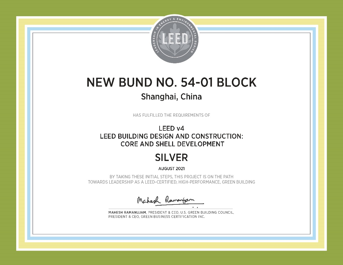 咨询公司技术团队在项目前期建筑开发和规划设计阶段介入,凭借多年来在LEED认证服务领域的优势,基于认证目标,以成本增量最小为原则,针对项目设计情况提供技术要求。作为专业咨询服务团队,咨询公司“前滩54-01地块”项目组在不同审图节点为业主提供了专业可靠的审图意见,保证项目在可持续场址认定、用水效率、能源利用、材料资源、室内环境品质方面的绿色技术落实到位,并按照LEED认证要求提供申报材料,与美国GBCI审核团队积极沟通,最终顺利拿到LEED银级预认证证书,获得业主方一致认可。