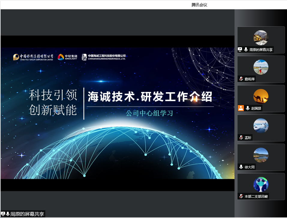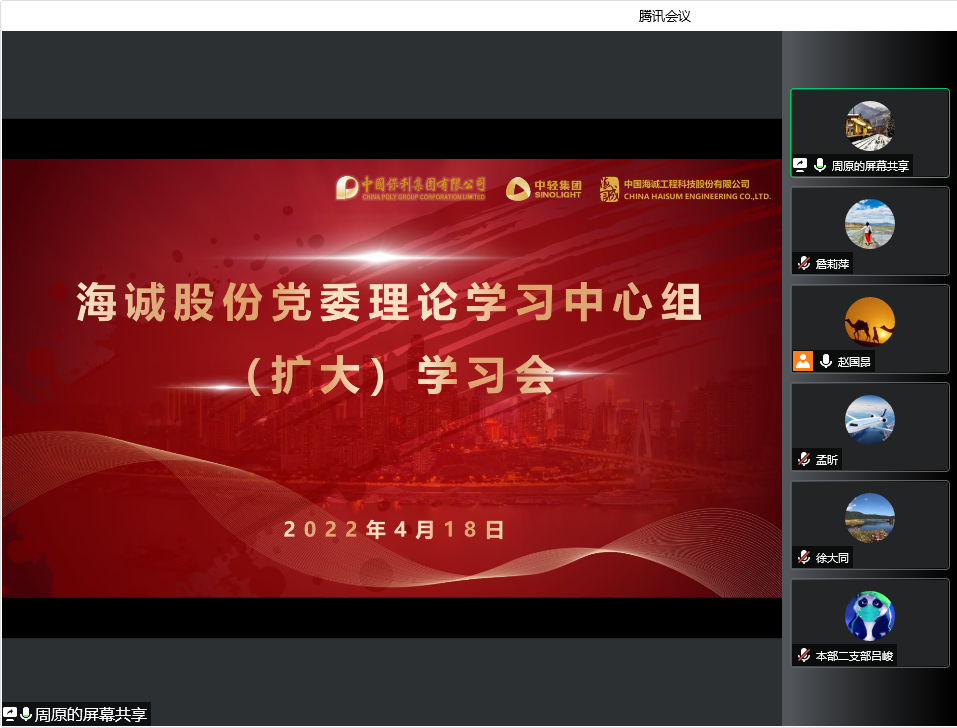 2022年4月18日下午,海诚股份党委以视频会议形式,召开2022年度第一次理论中心组(扩大)学习会?;嵋橹魈馐?ldquo;科技引领、创新赋能”?;嵋橛晒镜澄榧恰⒍鲁ふ怨褐鞒?,公司领导班子成员、总部职能部门负责人、各直属党支部书记、技术研发中心员工等31人参加了学习。