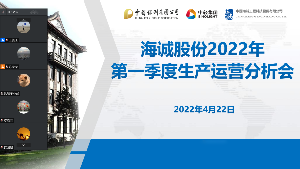 2022年4月22日,中国海诚以视频形式召开2022年第一季度生产经营分析会,深入贯彻保利中轻2022年一季度工作会决策部署,全面总结一季度工作,研究部署下阶段重点任务。中国海诚党委书记、董事长赵国昂视频参会并作讲话,党委副书记、总裁陈荣荣主持会议。公司领导班子成员、总部部门负责人、上海本部和各子公司领导班子成员及财务、数字化、生产运营等相关人员在各分会场参加会议。