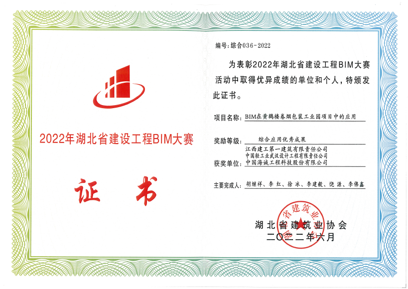 近日,湖北省建筑业协会对2022年度湖北省建设工程大赛成果进行公布,中国海诚武汉公司主导完成的“BIM在黄鹤楼卷烟包装工业园项目中的技术应用”荣获综合类优秀成果奖。