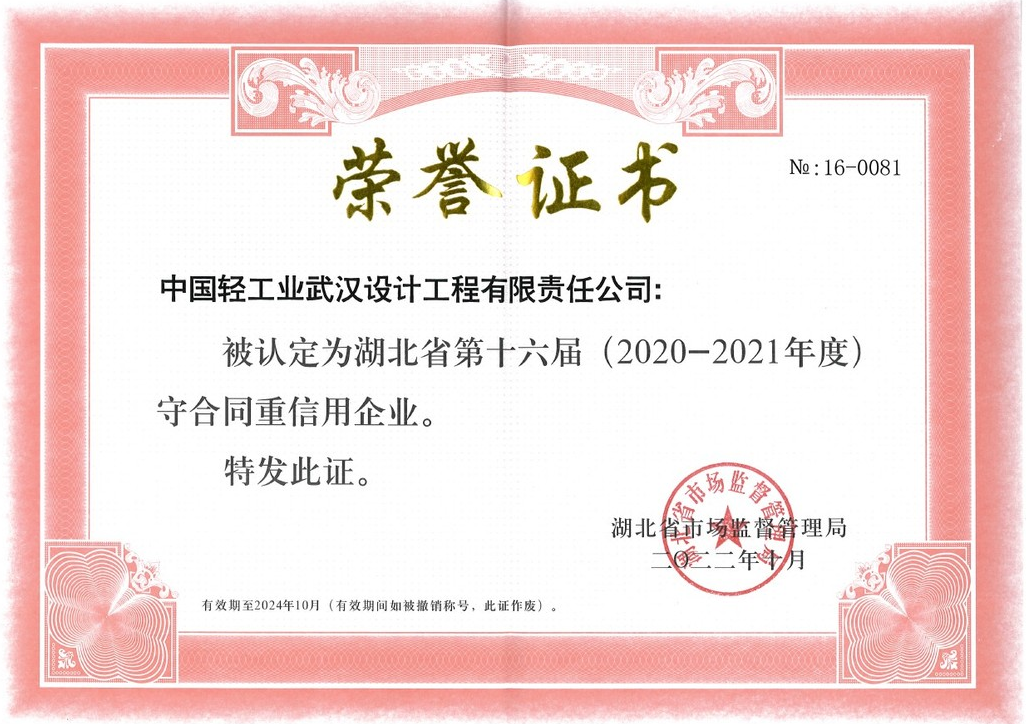 近期,在湖北省第十六届(2020-2021年度)“守合同重信用”企业评选中,中国海诚武汉公司再次喜获“守合同重信用”企业称号。