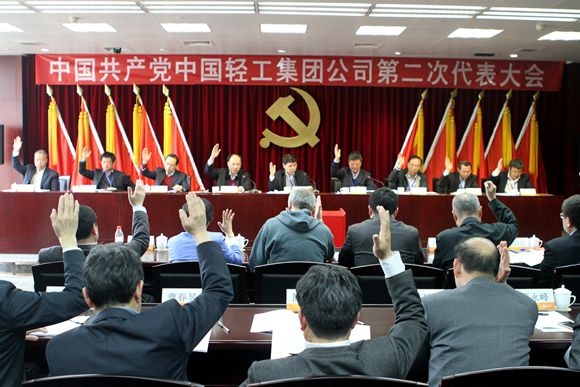 代表们举手表决通过大会《中国共产党中国轻工集团公司第二次代表大会选举办法》
