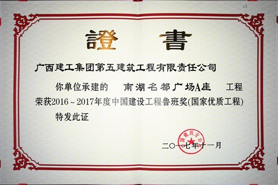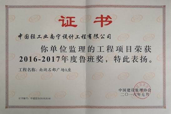 近日,海诚股份南宁公司监理的工程项目—南湖名都广场荣获中国建设监理协会授予“2016-2017年度鲁班奖”。鲁班奖是中国建筑行业工程质量最高荣誉奖,这是公司继广西壮族自治区人民检察院业务技术侦查综合楼(2005年获鲁班奖)、广西南宁市国土交易综合楼(2011年获鲁班奖)后,再次获此殊荣,具有里程碑的意义。