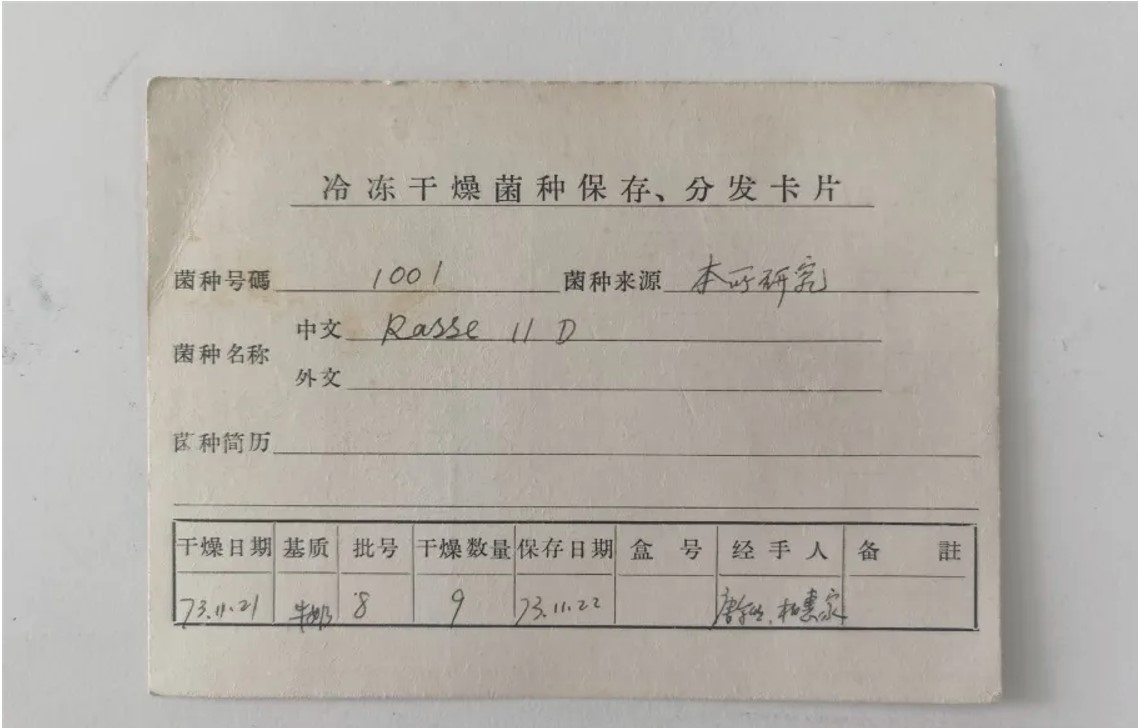 1973年制备的酿酒酵母1001的冻干管保藏卡片