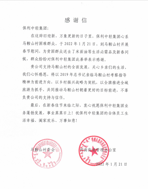 2022年,保利中轻将进一步贯彻落实好中央有关精神,扎实推进巩固拓展脱贫攻坚成果同乡村振兴有效衔接,践行央企社会责任,以优异的帮扶成果向党的二十大献礼。