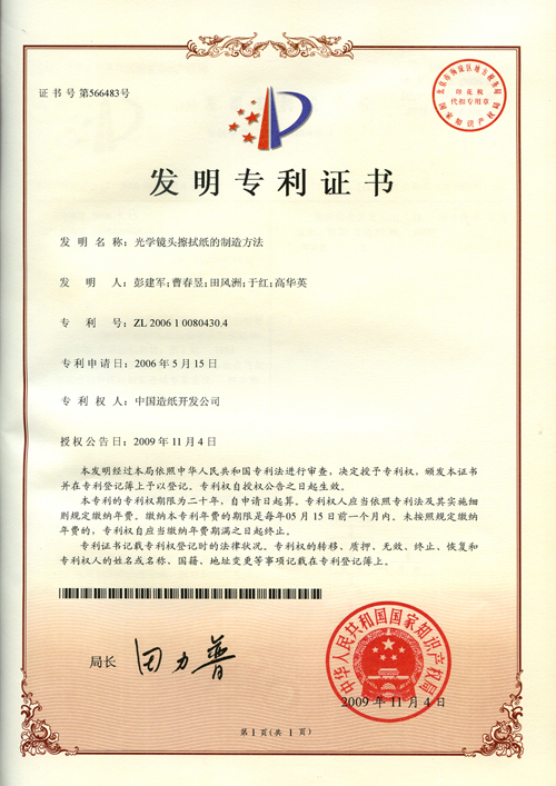 由中国制浆造纸研究院申请的两项发明专利“光学镜头擦拭纸的制造方法”和“全热空气换热器纸芯用隔离纸的制造技术”于11月4日获得国家知识产权局专利授权。