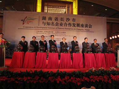 全国人大常委会原副委员长蒋正华在会上发表了讲话。他认为长沙在克服金融?;跋臁⑹迪钟趾糜挚旆⒄股先〉昧肆钊顺频赖某杉?,希望有实力的企业多到长沙看看,加强与长沙的交流合作,实现互利双赢。中共湖南省委常委、长沙市委书记陈润儿在会上介绍了长沙的发展成就和投资优势,表达了加强长沙与知名企业合作,实现互利共赢的良好愿望?;嵋橛沙ど呈形笔榧?、市长张剑飞主持。