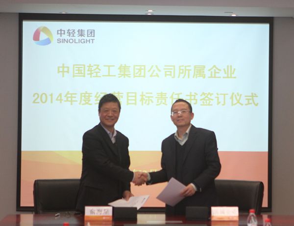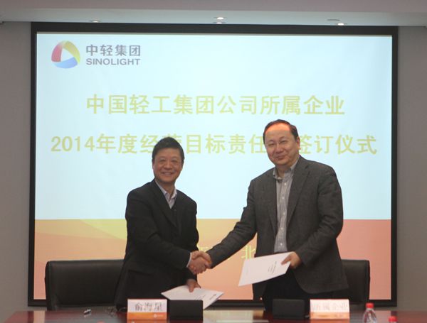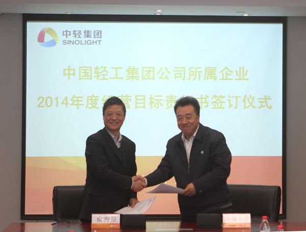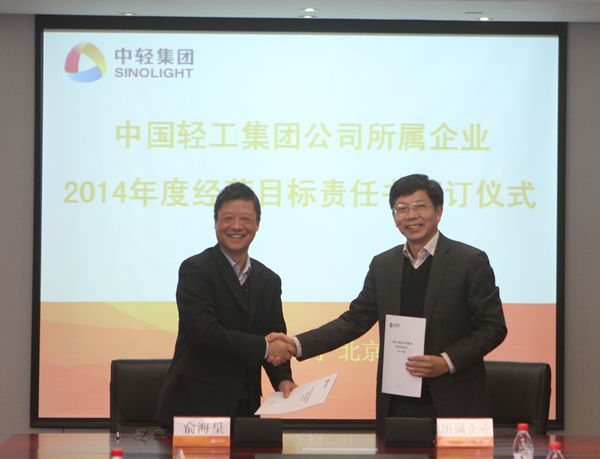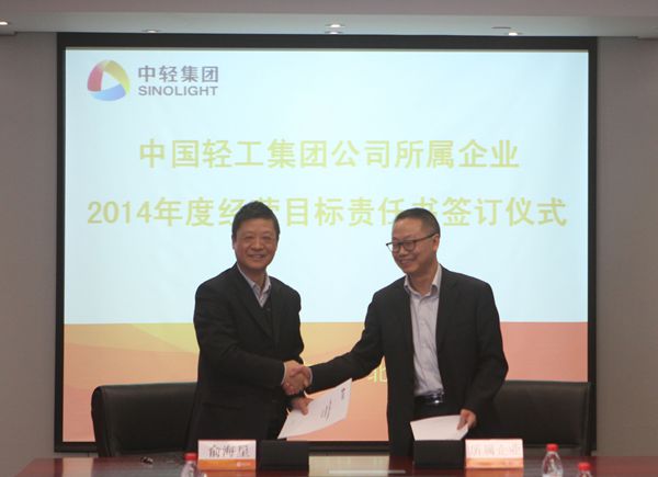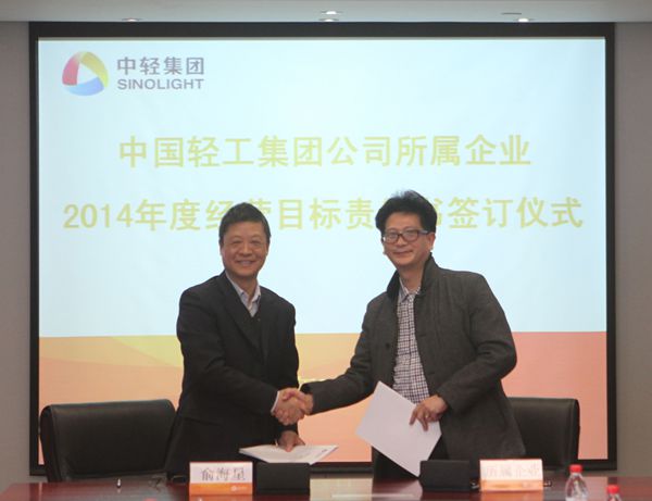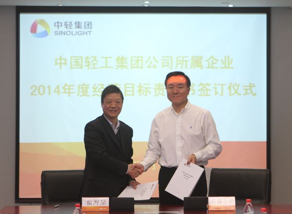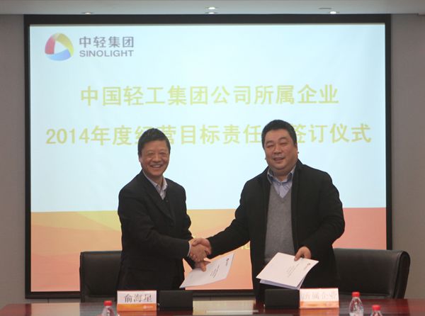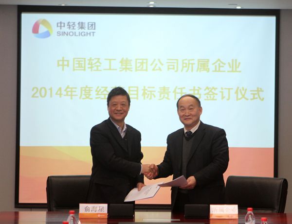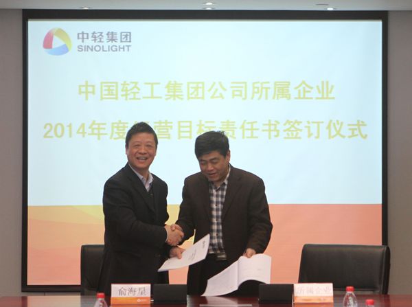 集团公司总经理俞海星与中轻对外公司副总经理马江(代)签订经营目标责任书