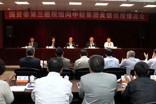 10月13日上午,国资委第三巡视组向中轻集团反馈巡视情况会议在中轻集团总部中轻大厦召开。国资委第三巡视组组长韩修国,国资委巡视工作领导小组成员、巡视办主任阮国平,第三巡视组副组长于学范,第三巡视组张和之、闫小峰和巡视办袁正秋同志,中轻集团领导班子成员,集团外部董事出席了会议。韩修国代表巡视组作巡视情况反馈,中轻集团党委书记、董事长陈鄂生作表态发言,党委副书记、总经理俞海星主持会议。